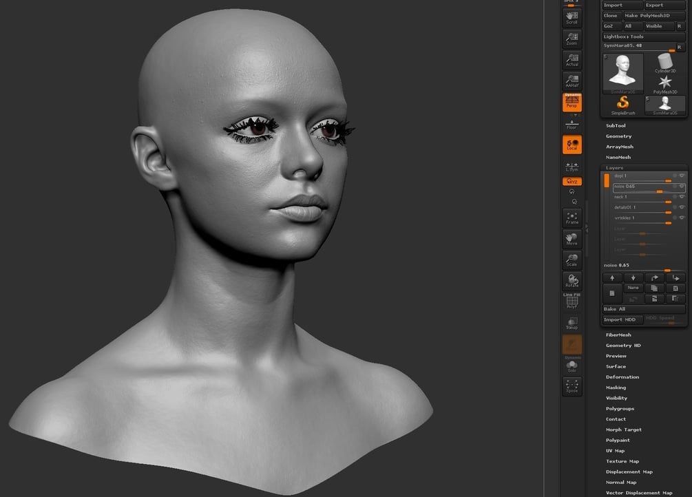 Zbrush 4R7 P3 Girl head basemesh, 7 subd levels, 10 000 000 polygons, small details in separate layer so it's easy to modify big shapes without destroying small details, 4k color texture. Could be used for personal or commercial project.